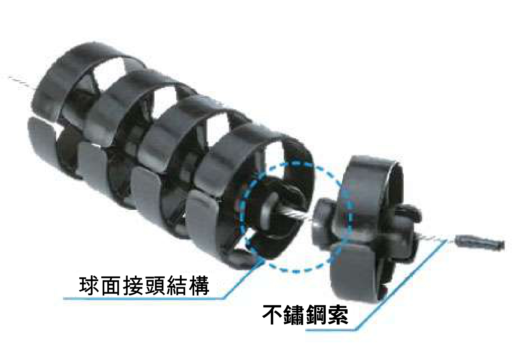 工程塑膠製成的鏈節(jié)兩端以球面接頭結構連接,鏈節(jié)中心內建不鏽鋼索,確保強度與靈活性。